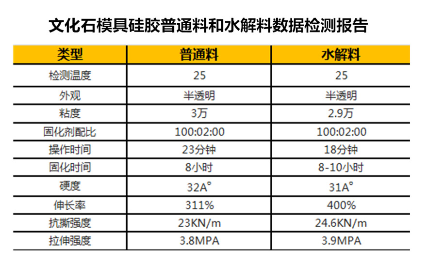根據(jù)下面的文化石模具硅膠的普通料和水解料數(shù)據(jù)檢測報告可以看出,水解料生產(chǎn)出來的模具硅膠看上去和普通料生產(chǎn)的相關(guān)不了多少,但這問題在使用一段時間后就會明顯的凸顯出來。